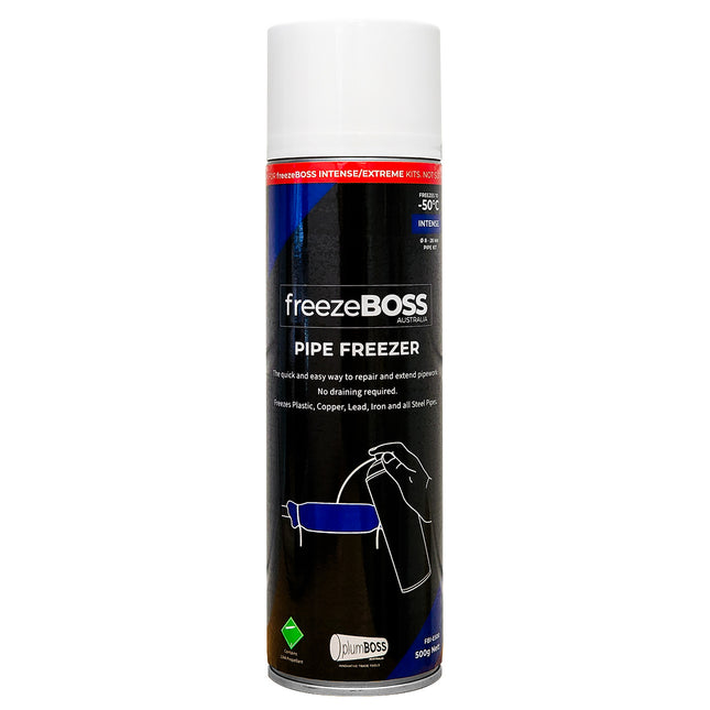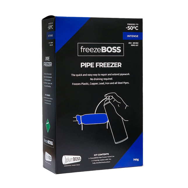 INTENSE Pipe Freezer Kit 8-28mm KIT CONTAINS 1 x freezeBOSS Intense 415ml can 2 x Disposable 8-28mm freezing Jackets Ice plug duration approximately 45 minutes 1 intense can will give you 2 freezes up to 15mm or 1 freeze up to 25mm FEATURES Fast action freezing Freezes steel, copper & plastic pipe Holds pressure up to 230PSI (Which is on average much greater than domestic water mains supply) Ice plug lasts up to 45 minutes Prevents the need to shut off the water mains Always have one on hand for emergencies