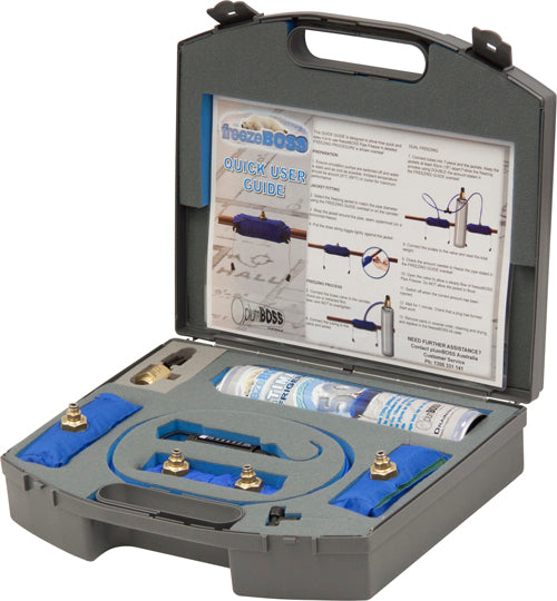 ULTIMATE Pipe Freezer Kit 8 - 35mm pair of 8 - 15mm re-usable freezing jackets A pair of 15 - 22mm re-usable freezing jackets A pair of 25 - 35mm re-usable freezing jackets Brass regulator valve A pair of hoses Weighing scale T - connector 2 × Canisters of freezeBOSS ULTIMATE Refrigerant 580ml Sturdy Carry Case 14 × 15mm freezes freezeBOSS Pipe Freezer Kits This high quality product makes pipe freezing much easier and more effective than ever before. The range of freezeBOSS products has been designed to cater for almost every job NO MAINS WATER SUPPLY SHUT DOWN FAST ACTION FREEZING NO DRAINING DOWN ICE PLUGS LASTS UP TO 45 MINUTES FREEZE STEEL, COPPER & PLASTIC PIPE LINES HOLDS PRESSURE IN EXCESS OF 230PSI (WHICH IS ON AVERAGE MUCH GREATER THAN DOMESTIC WATER MAINS SUPPLY)