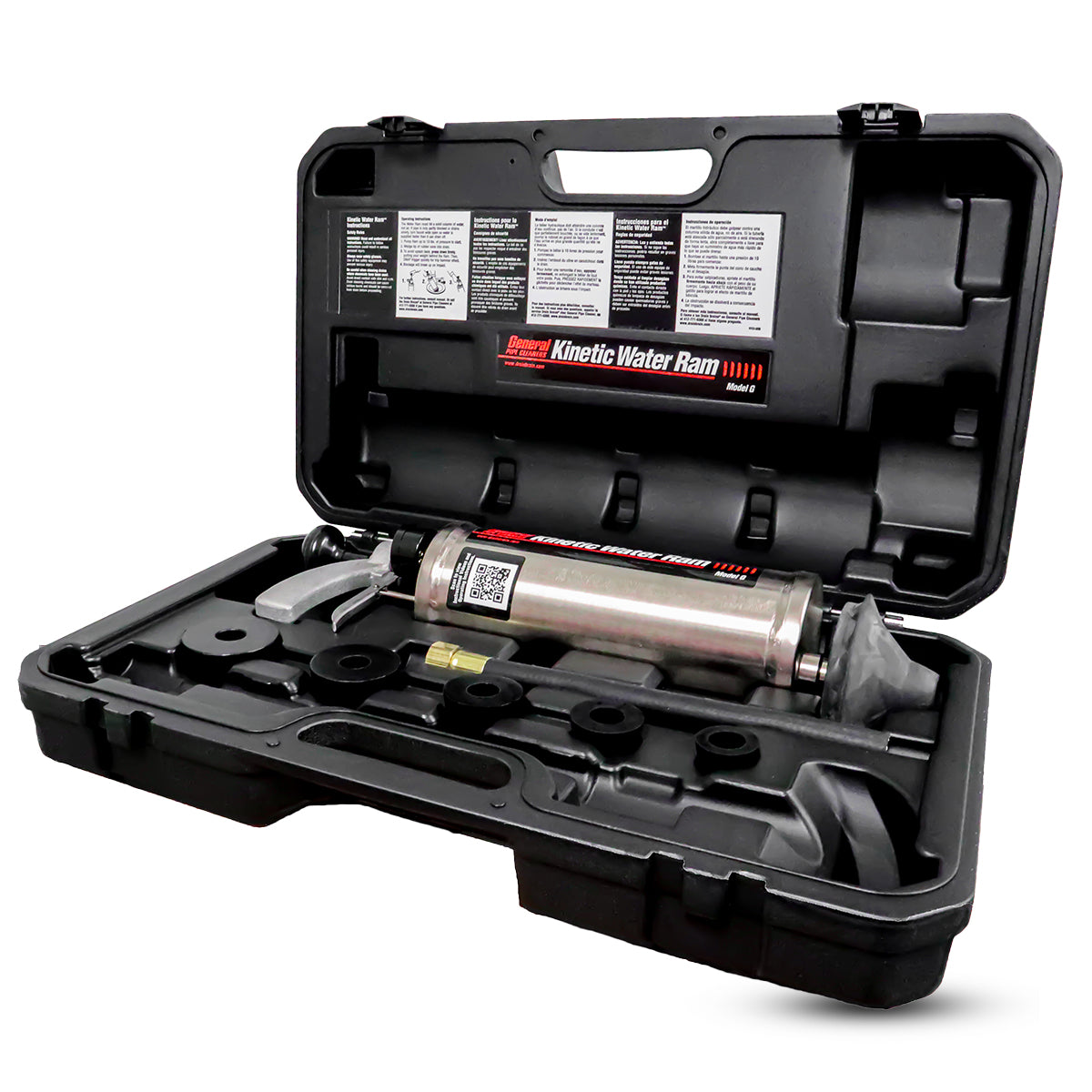 The Kinetic Water Ram uses a burst of compressed air that drives a shock wave (kinetic energy) through water to break up stoppage. It's particularly useful when the stoppage is on the far side of a drum trap or series of tight bends, since the shock wave can travel around bends without losing its force.