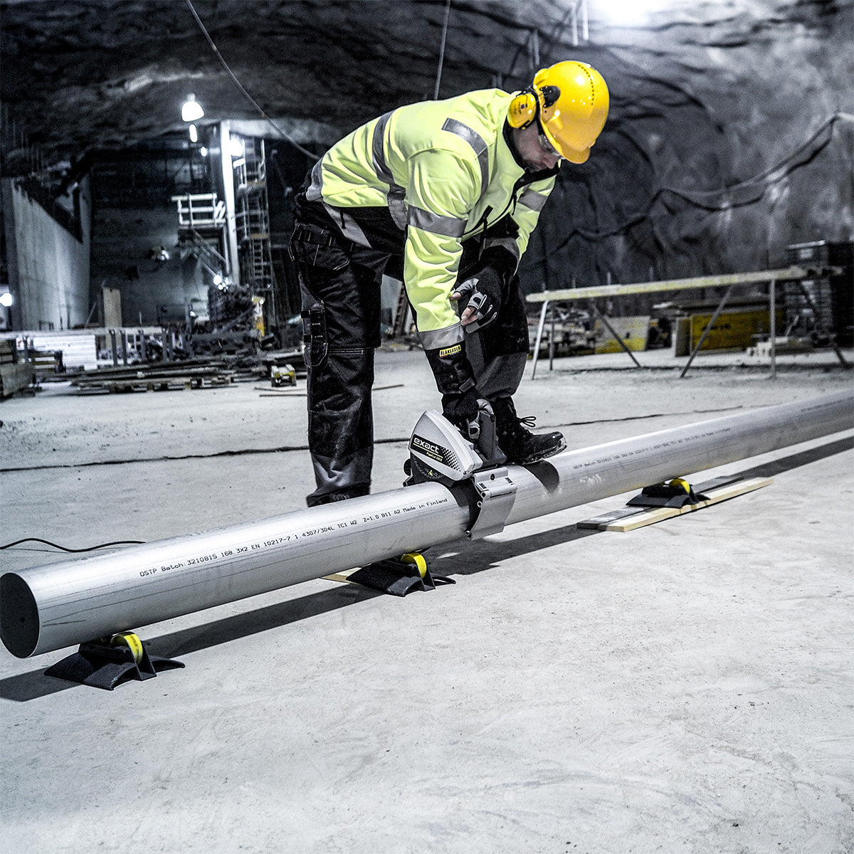 The ease of use also improves work safety; no special skills or long-term training is needed to operate plumBOSS exactCUT smoothly. The entire weight of a plumBOSS exactCUT rests on the pipe being cut, so using it is easy and safe, and only about a metre of working room is required. During operation, the saw is firmly attached to the pipe and cannot work itself loose from the operator's grasp.